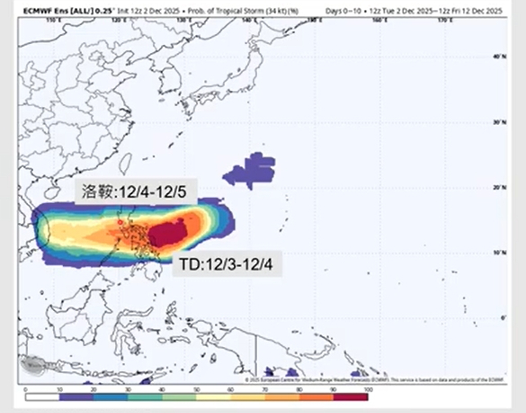今天(3日)受東北季風影響,北部及東半部水氣較多,氣溫也明顯下降,今晚至明(4日)晨最冷,苗栗以北低溫下探12度,影響至周五(5日);氣象專家賈新興表示,下周一、下周五分別還有2波東北季風接力南下,迎風面地區濕冷。此外,目前位於菲律賓東方海面的熱帶擾動,最快明天生成「洛鞍」颱風,路徑往菲律賓南方移動,對台灣沒有影響。